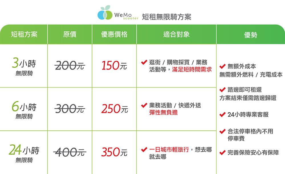 算是台灣共享機車服務龍頭品牌的 WeMo Scooter 以隨租隨騎的便利性、騎多少分鐘算多少分鐘的收費,不需要保養、不需要負擔油錢,甚至還只要停放在公有停車格就能完成還車的輕鬆,算是受到不少年輕族群的喜愛,現在隨著暑假的到來,WeMo Scooter 也推出了「無限騎方案」方案,共有 3 小時、6 小時與 24 小時三種選擇,收費則是分別為 $150、$250 與 $350,這個無限騎方案將自 7 月 3 日開始實施,用戶能夠直接透過 app 就來選擇適合自己的方案!