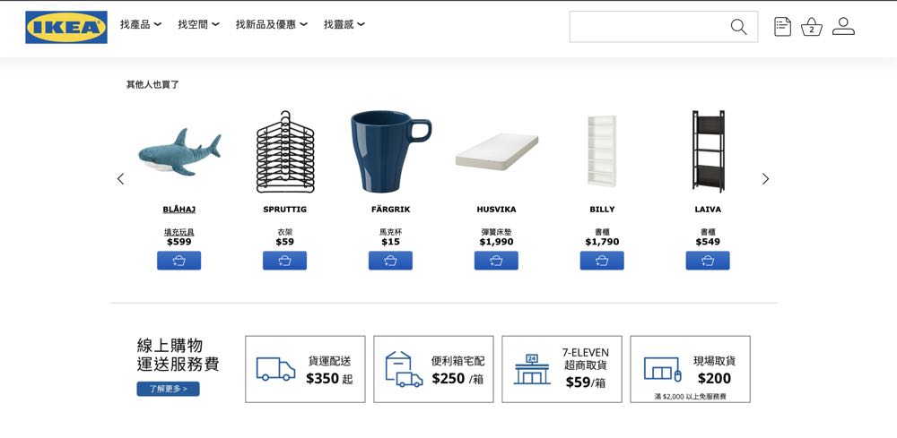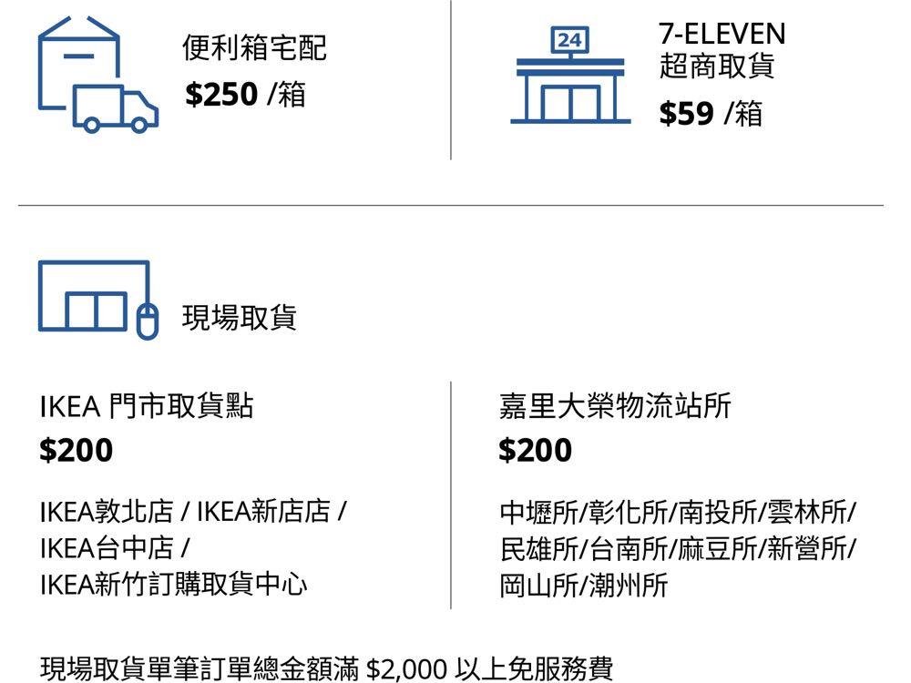 其實 IKEA 線上購物的運費方式分別有貨運配送 $350 起、便利箱宅配每一箱 $250 、7-11 超商取貨一小箱 $59和現場取貨 $200 (滿 $2,000 免費)這四種。