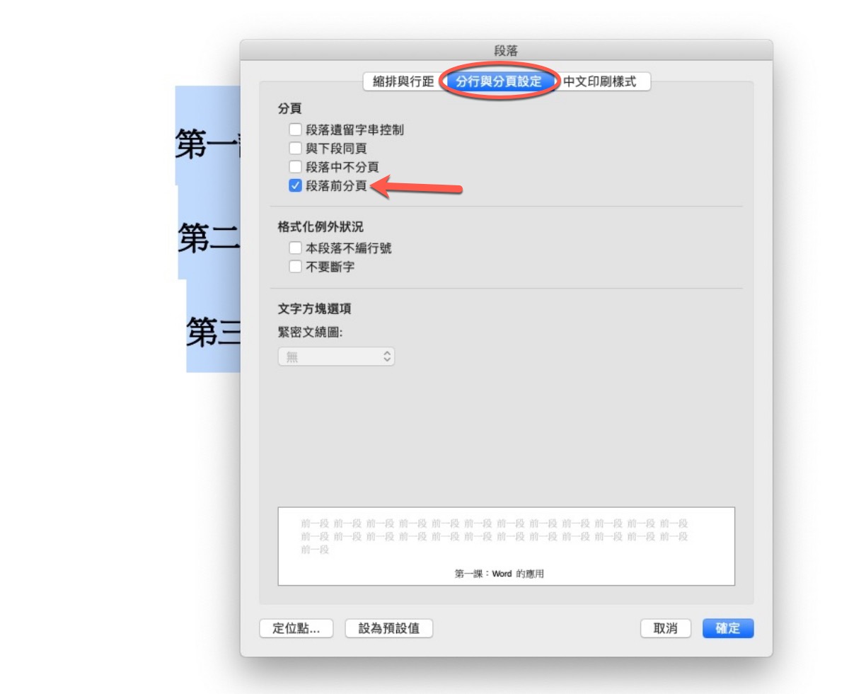 在頁籤「分行與分頁設定」中,將「段落前分頁」勾選起來後按下確定。