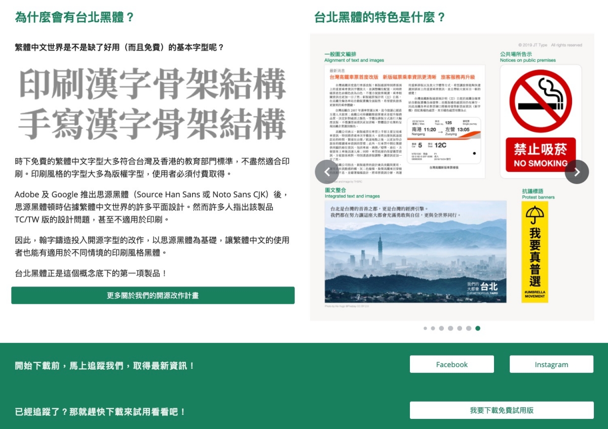 思源黑體等,就一般使用來說已經都相當夠用了,近期由翰字鑄造以思源黑體做為基礎進行修改,推出全新的「台北黑體」,目前以三個字重先行開放(light、regular、bold),隨後將在明年加上四個字重(extralight、normal、medium、heavy)釋出,而目前台北黑體是以適合印刷字體做為出發點所設計,可以商用哦。