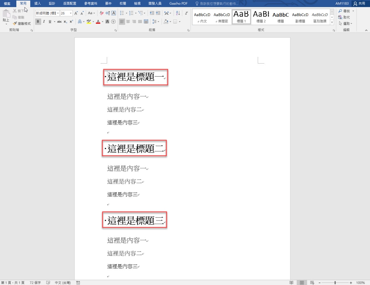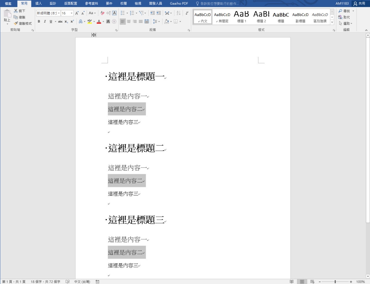 範例就像這樣,通常我們在編輯 Word 內容時,如果比較冗長的內容應該就會有像這樣規律的分類,當如果完成後,你想要再修改某一內容的文字格式,我看很多人都會一個個選擇慢慢修改,今天就是來教大家這個,比如一次全選標題一,或全選內容一,就能一次性來修改內容格式,不用一個個來。