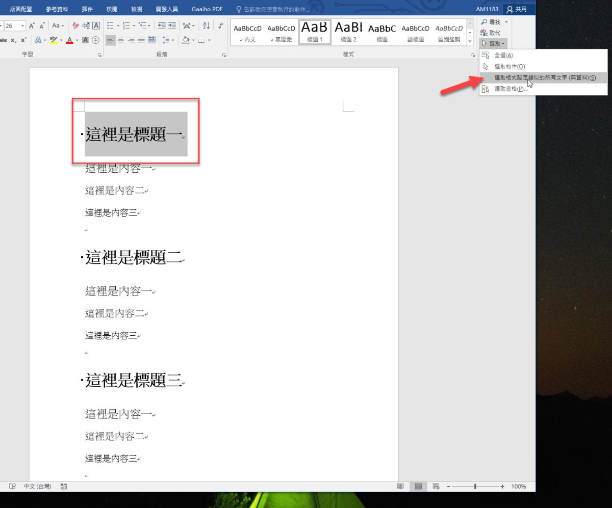首先選擇要全選的格式,比如標題,然後在右上角選擇「選取」,再選擇「選取格式設定類似的所有文字」。