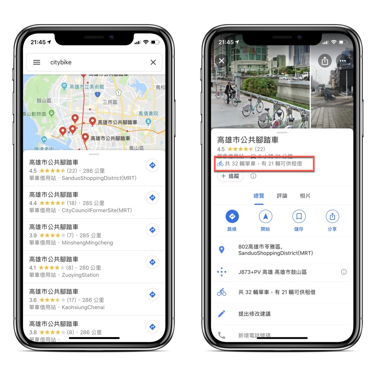 Google 地圖能查詢的資訊真的是愈來愈多,也不枉費平常我最愛用的就是 Google 地圖,而一年前在國外就已經先行推出的共享單車資訊查詢功能,終於也輪到台灣了,目前支援新北市和高雄市(台北市居然不是先開放的了),除了可以查到附近哪裡有 YouBike 或 CityBike 租借外,還可以即時顯示目前剩餘空車有多少,當然,你也可以開啟 YouBike 的 APP 啦,只不過結合在 Google 地圖裡真的頗直覺的。