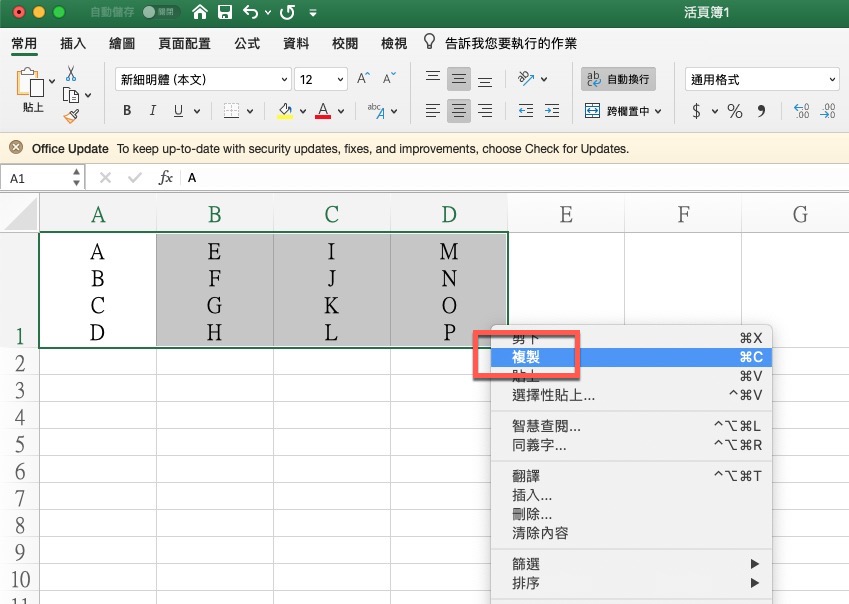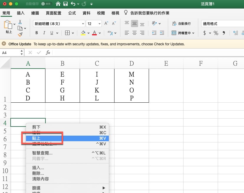 先說一下需求,這次網友問的是,像這樣資料都擠在 A1 ~ D1 欄位裡,我要怎麼將他拆到比如 A4~A7 這樣的各別欄位。