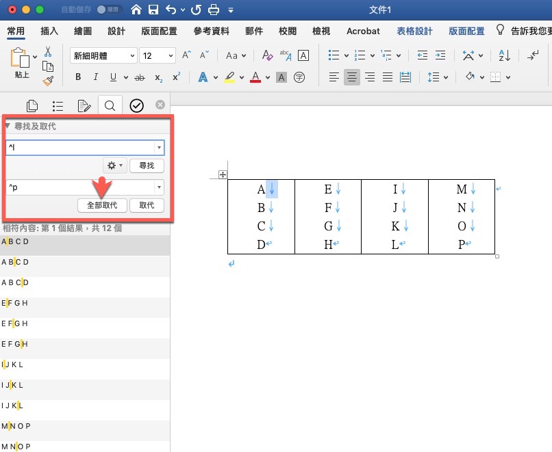 接下來按下組合鍵 Ctrl + H,打開尋找及取代功能,要尋找的值請輸入「^l」,取代的值輸入「^p」,按下全部取代。
