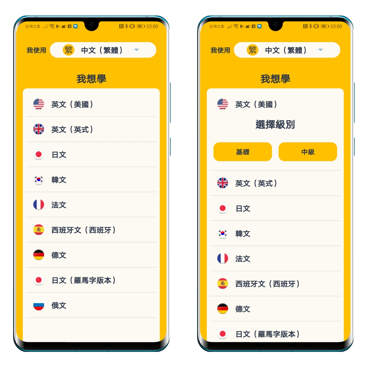 前面跟一般的語言 APP 差不多,有多國語言可以選擇,並有級別可以選擇。