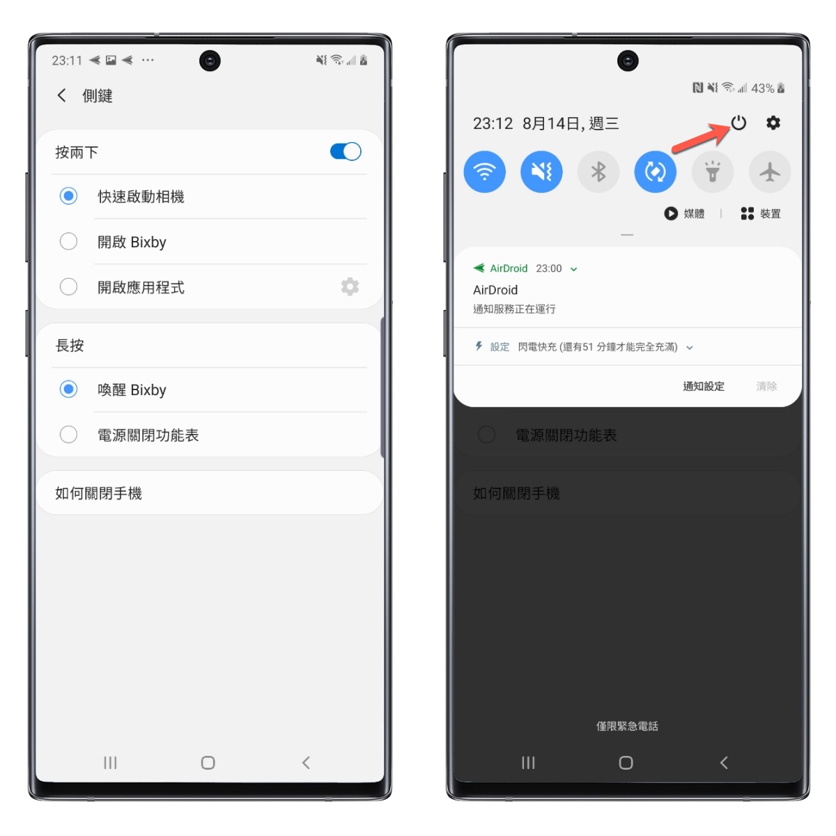 前面提到的側鍵功能,你可以在設定裡選擇按二下的操作以及長按的操作,如果長按不設定為關機使用的話,那平常要怎麼關機?這次 Samsung 也在通知欄的快捷鍵裡加入了關機按鍵,可以下拉選單後就有關機鍵可以點擊使用。