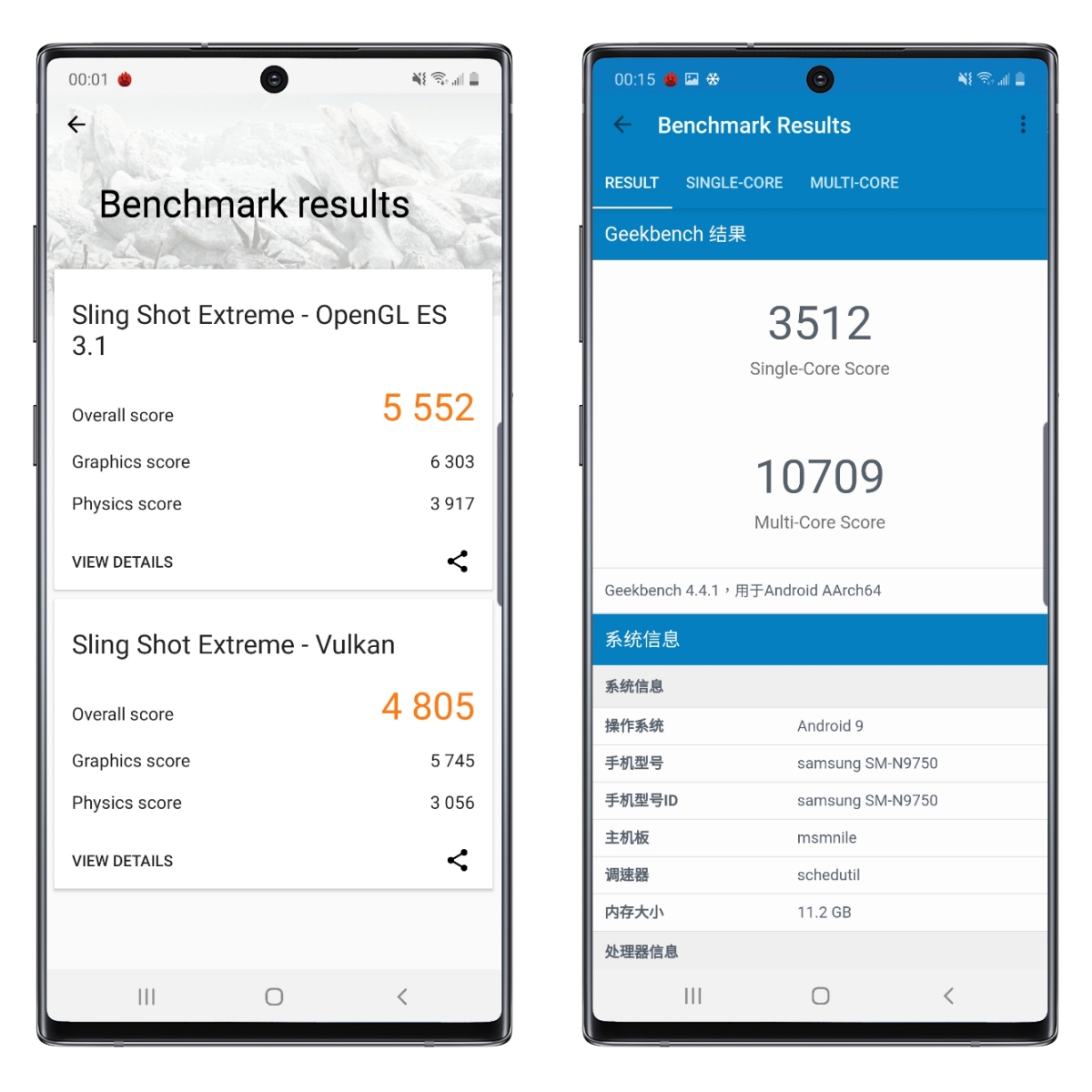 3DMark 測試下分別為 5,552(OpenGL ES 3.1)及 4,805(Vulkan),而 GeekBenchmark 的測試結果為 3,512(單核)、10,709(多核)。