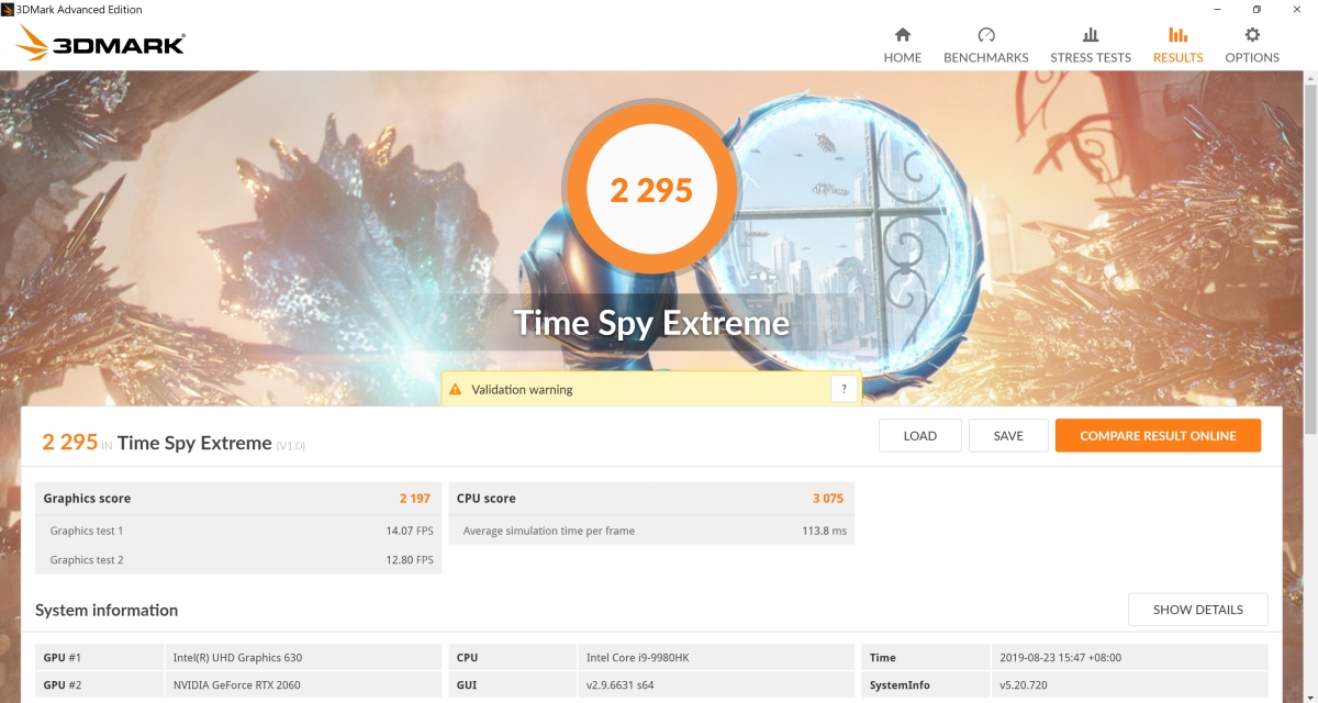 首先是 3D Mark 透過 Time Spy 獲得 2295 分,雖然 ZenBook Pro Duo 並不是主打電競使用,但有著讓人可以任性的頂級硬體規格,其實就算你在工作之餘要用來玩遊戲,老實說要和高階電競筆電相比也絲毫不會遜色。