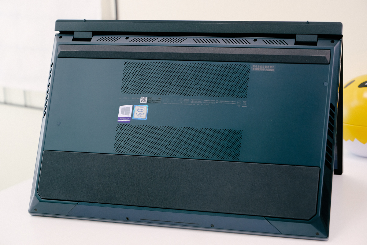 一般筆電的底部都是用四角防滑點的設計,而 ZenBook Pro Duo 採用超大面稱的軟墊設計,且上下都有,可以讓機身更不易滑動,使用時更加的穩定。