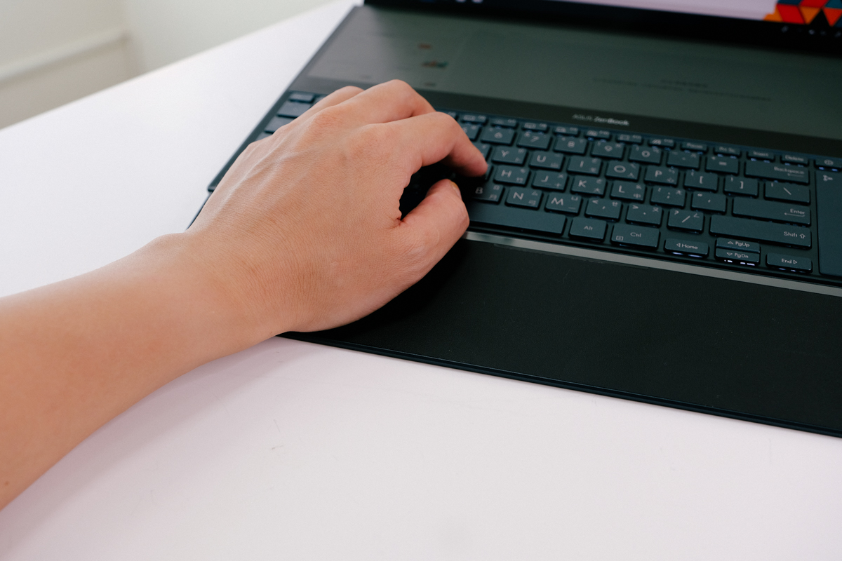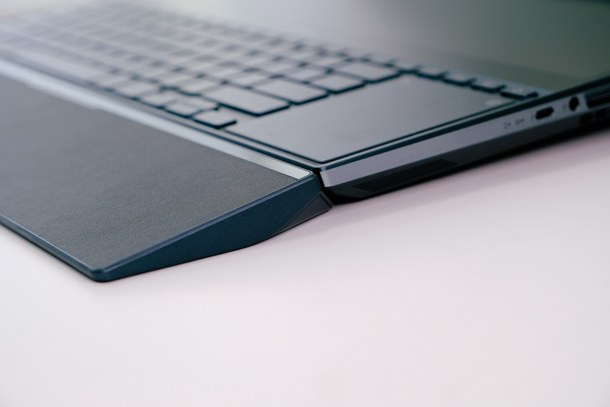 螢幕打開的 Ergolift 傾斜鍵盤設計將筆電底部墊高(而且這次那個看起來像打勾的設計好好看),在使用時能夠增加更多底部的散熱面積,ZenBook Pro Duo 也由於硬體效能相當頂規,更是需要散熱,由螢幕墊起的高度也比起一般筆電高不少,但相對的,更加傾斜也讓手靠著使用時增加舒適感。