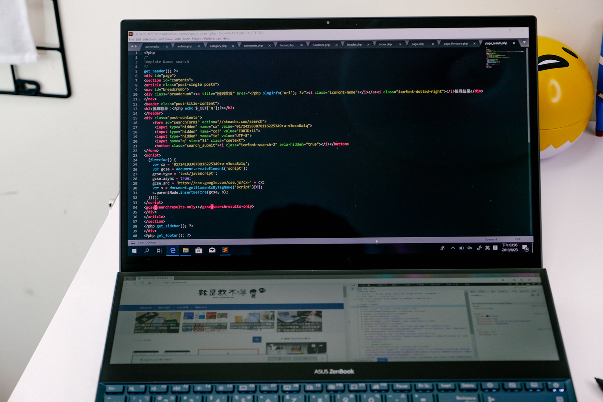 像阿湯平常也有在編寫網頁程式,以雙螢幕的運用來說,主螢幕會是我的網頁程式,ScreenPad