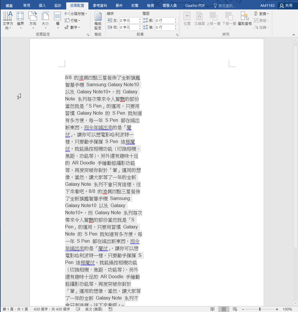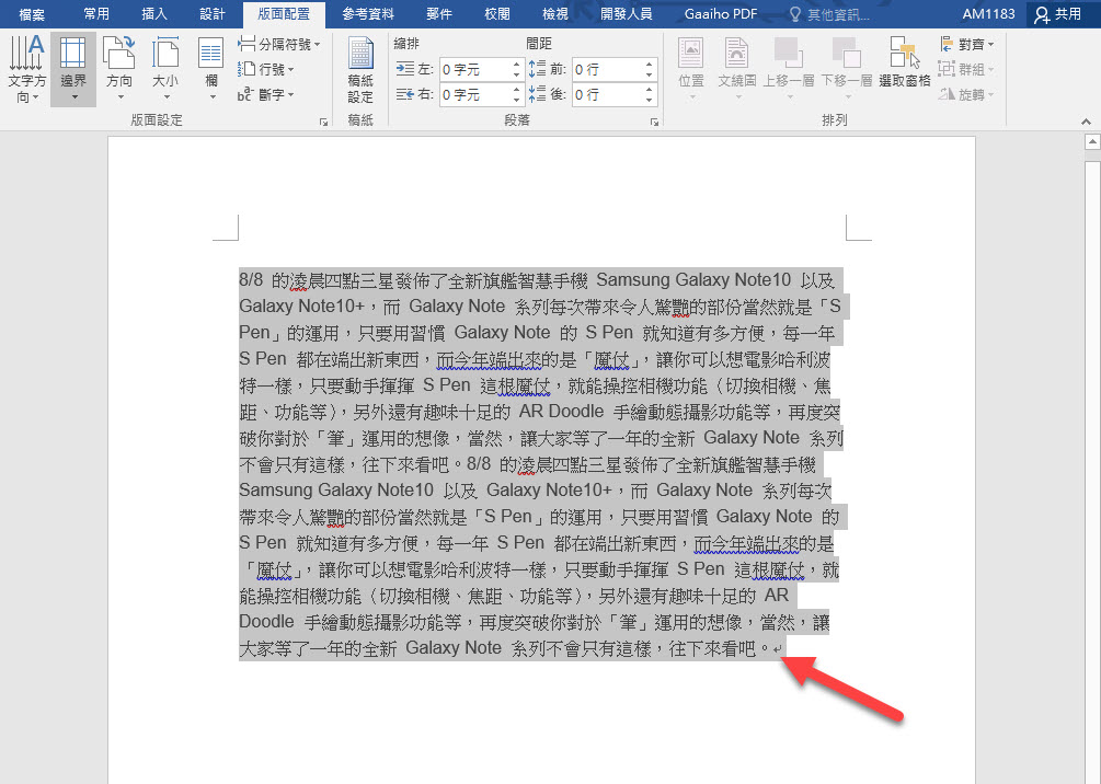 來跟大家講解一下正確做法,首先,不要用「全選」的方式選擇內容,注意看,用全選的話,會把最後一個段落標記也選到,就是這個標記造成我們無法等高分二欄。