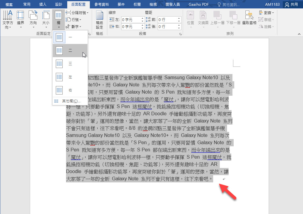 正確應該要像這樣,選到最後一個字為止,且不要選到段落標記後,再去選欄,就會變成等高二欄了。