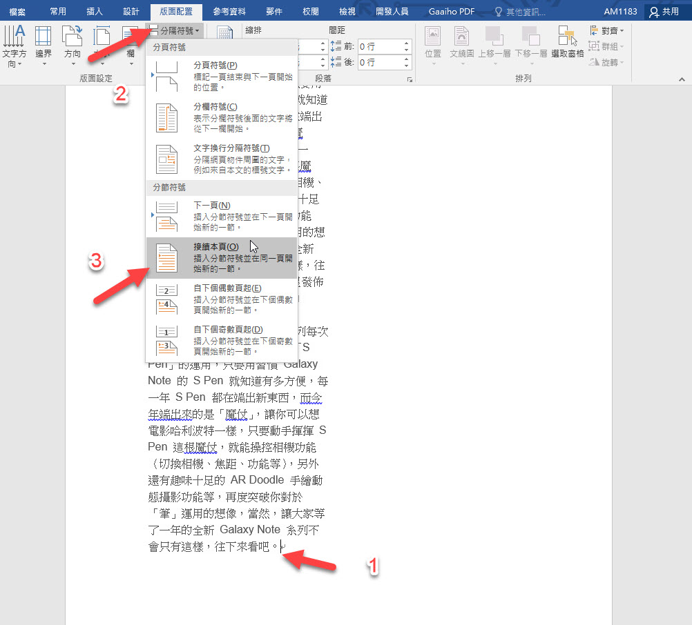 當你全選後,選擇欄 > 二,不是都會擠在左邊同一欄嗎?這時你將滑鼠點一下最後一個位置,然後再選擇版面配置 > 分隔符號 > 接續本頁。