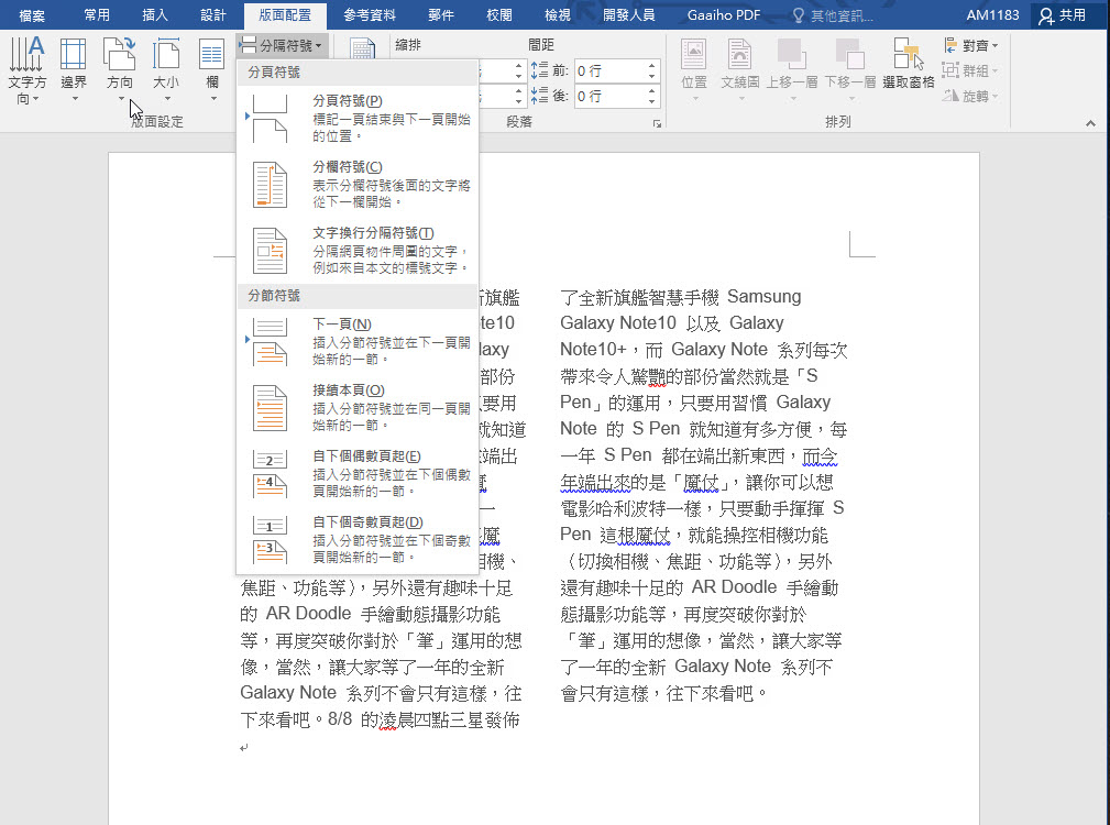 先給大家看一下,這是我們想要呈現的結果,就是選了要變成等高多欄的文字後,在版面配置中選擇欄裡的「二」,就應該要變成這樣,不過大部份人應該會是下一個畫面。