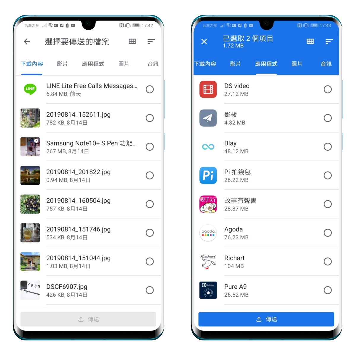 這時傳送端可以選擇要傳送的檔案,連 APP 都可以選擇,非常的屌啊。