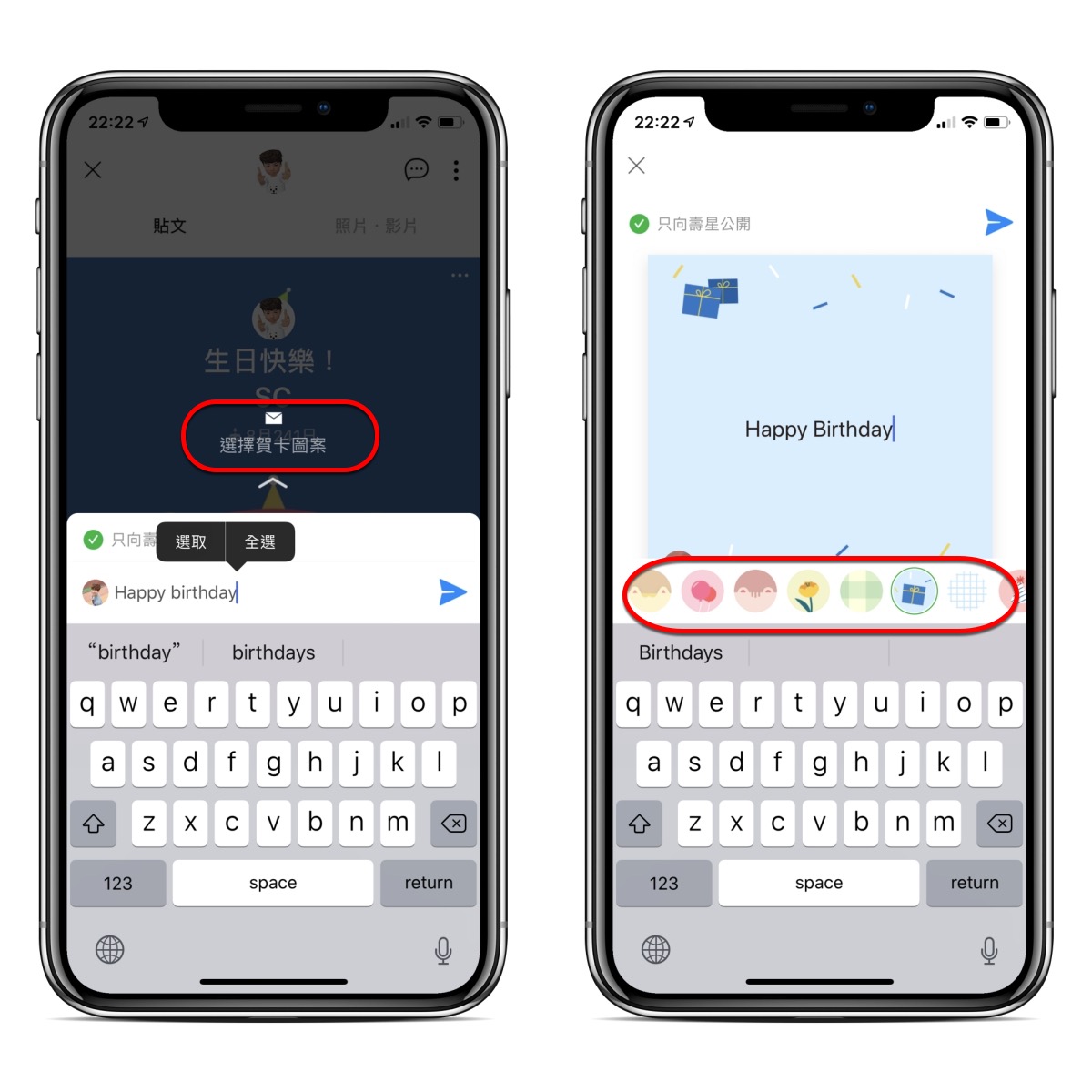 賀卡撰寫主要就是文字以及基本背景可以選擇,還可以選擇是僅讓壽星看到,或是在貼文串公開顯示。