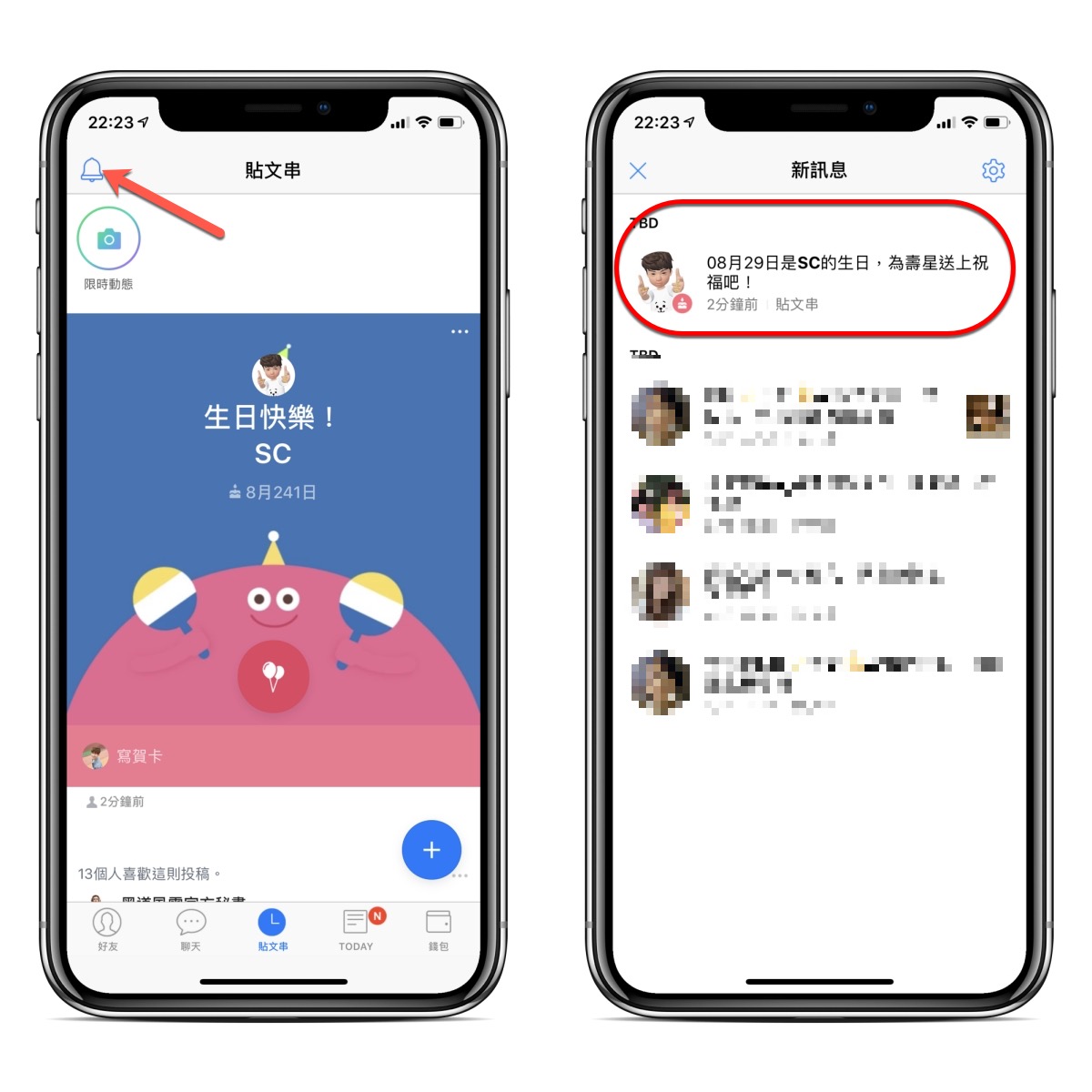 如果你想要看看你的好友名單中最近有誰快生日了的話,可以進入貼文串後,點擊上方的小鈴噹圖示,這裡就會顯示誰當天生日或即將生日,讓你可以儘早準備撰寫賀卡。