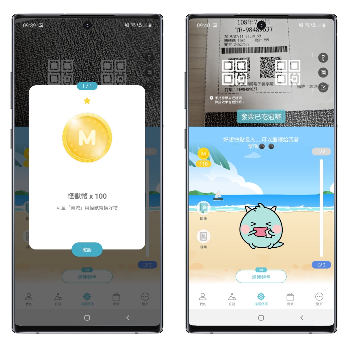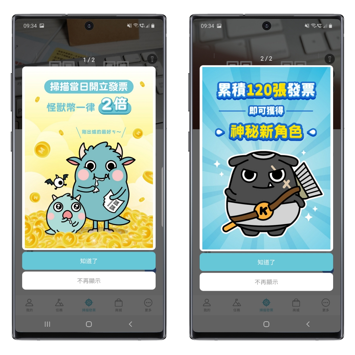 一般每張發票掃瞄會獲得 10 元怪獸幣,如果是掃瞄當日的發票是二倍,最近的任務活動中,累積 120 張發票時還可以兌換新角色(60 張也會獲得新角色),我想隨著開發會有愈來愈多怪獸加入吧。