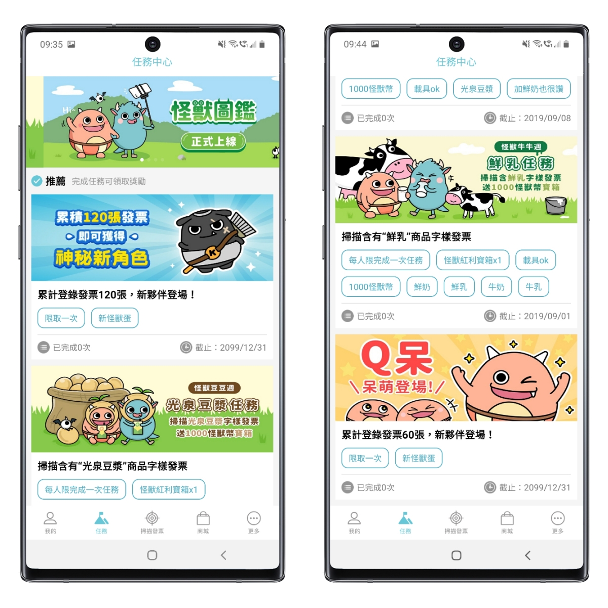 如果想要獲得更多怪獸角色,可以到任務中心裡來查看,比如像開頭講的,登錄 120 張發票就會獲得新角色,而其中 Q 呆這個角色只要掃瞄 60 張就會獲得,其他還會有一些限時活動,可以額外獲得怪獸幣或寶箱。