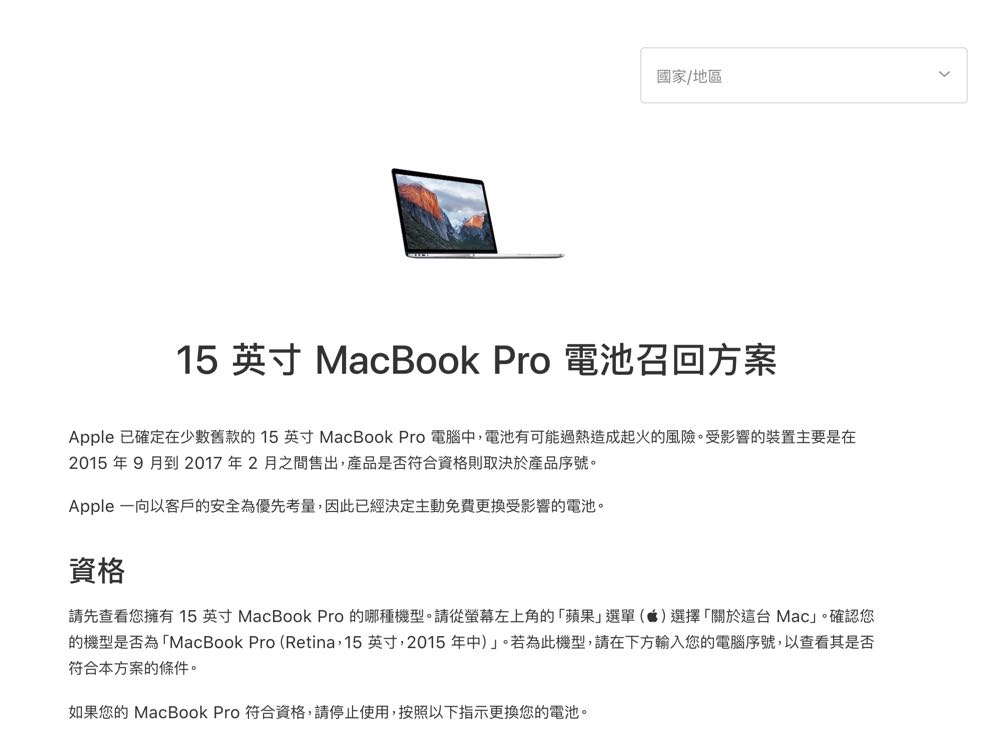 Apple 日前公佈了「15 英寸 MacBook Pro 電池召回方案」,確定在少數舊款的 15 英寸 MacBook Pro 電腦中,電池有可能過熱造成起火的風險。受影響的裝置主要是在 2015 年 9 月到 2017 年 2 月之間售出,也提供了序號查詢功能,讓用戶能夠查詢自己手上的 MacBook Pro 是否符合免費更換電池的資格!