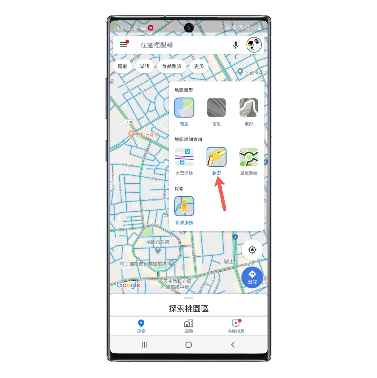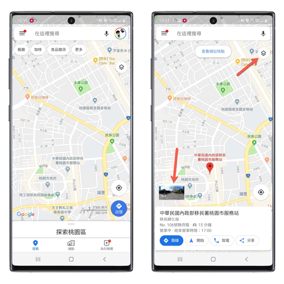 以前我們在手機 APP 上要看 Google 街景時,基本上做法都是點擊某一個地方後才知道有沒有街景服務(左下角會顯示),現在就不用這樣,先點擊右上角的圖層圖示。
