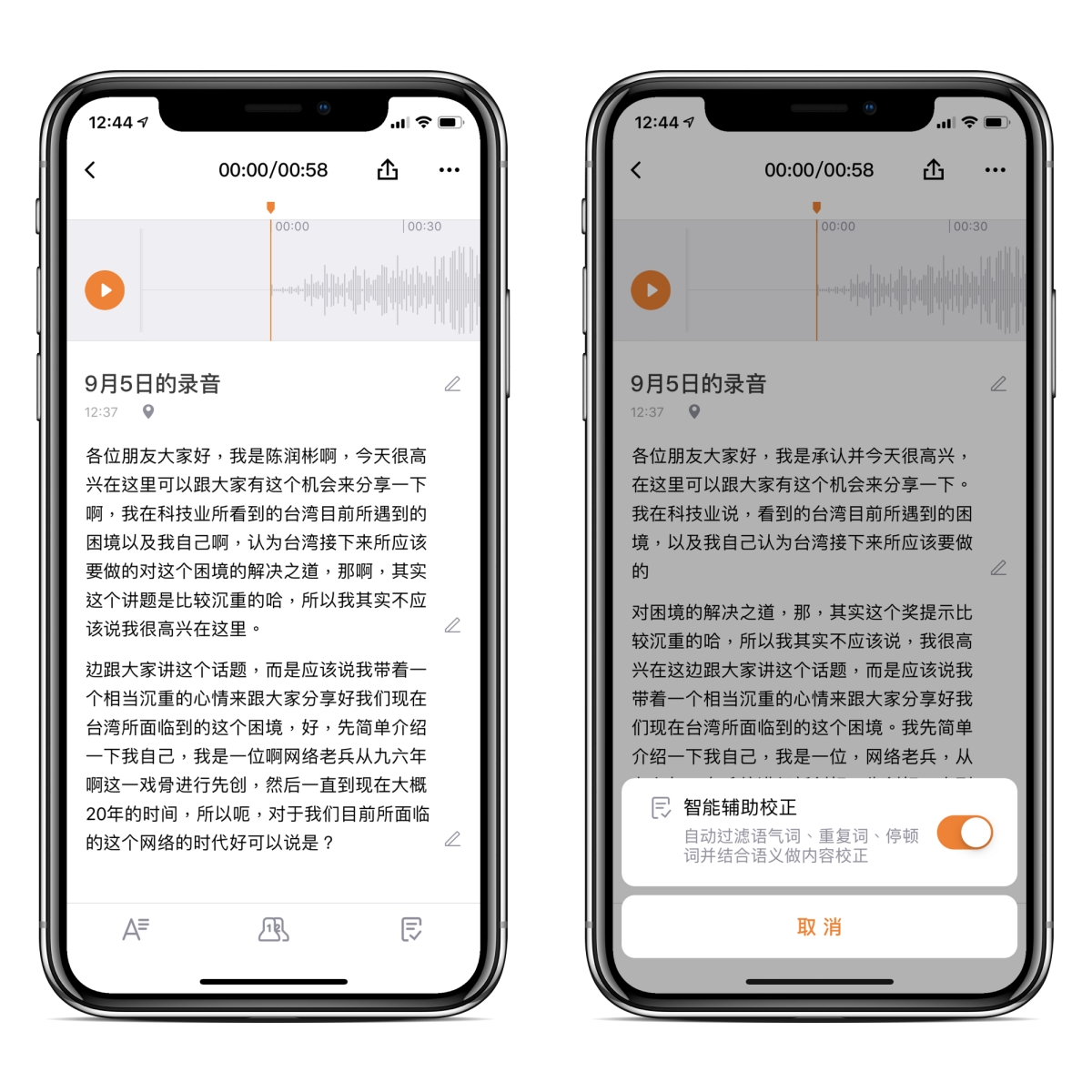 針對中文還可以智慧校正用詞,開啟後你會看到很多語助詞的哈、啊等都會自動去掉,讓文字看起來更順暢一些。