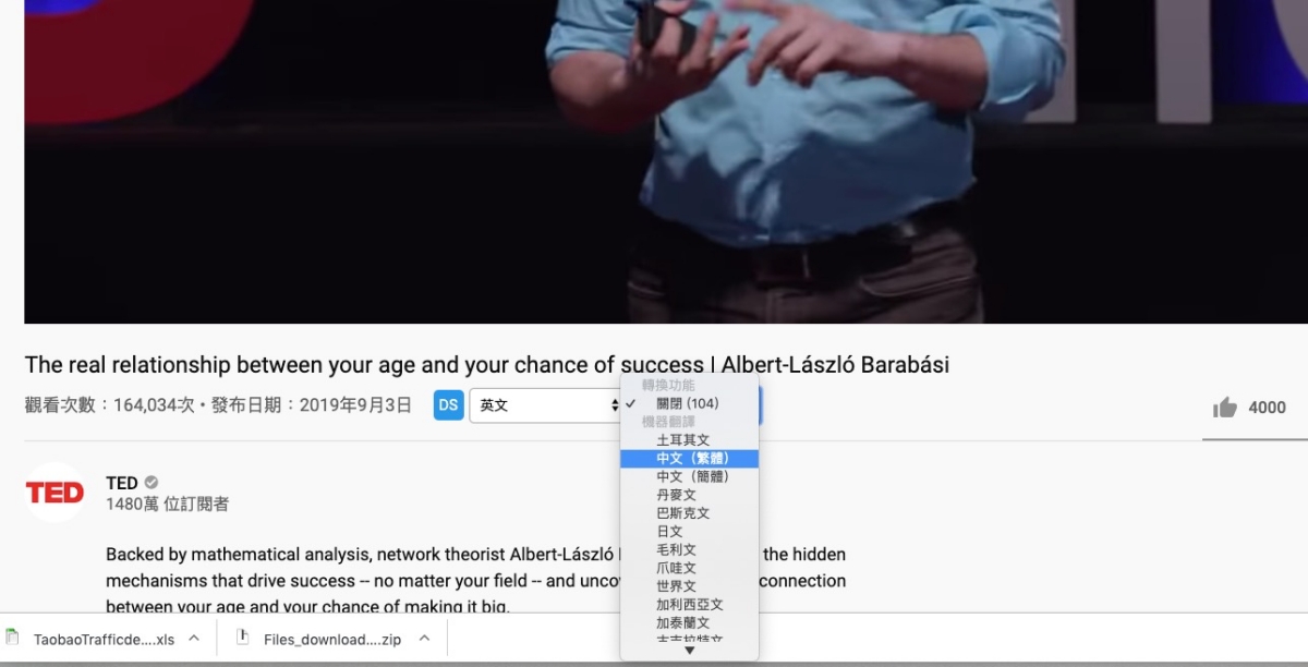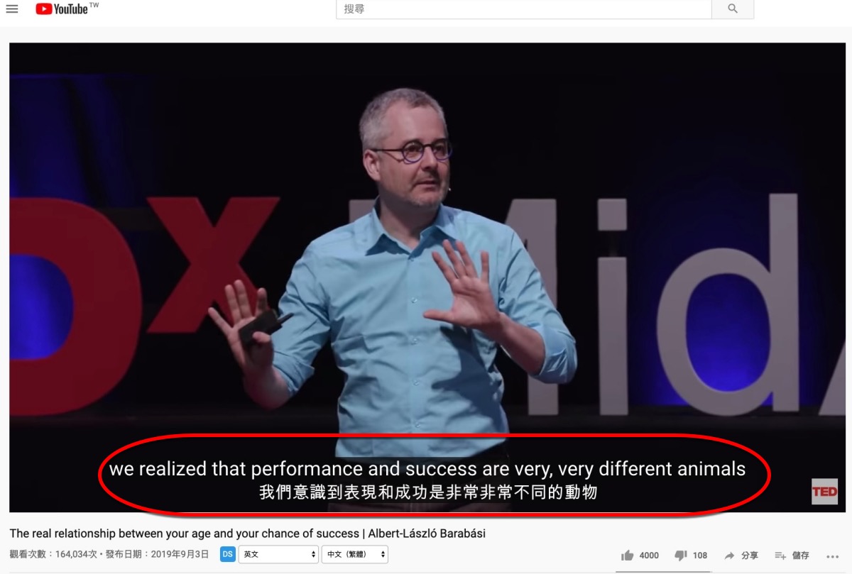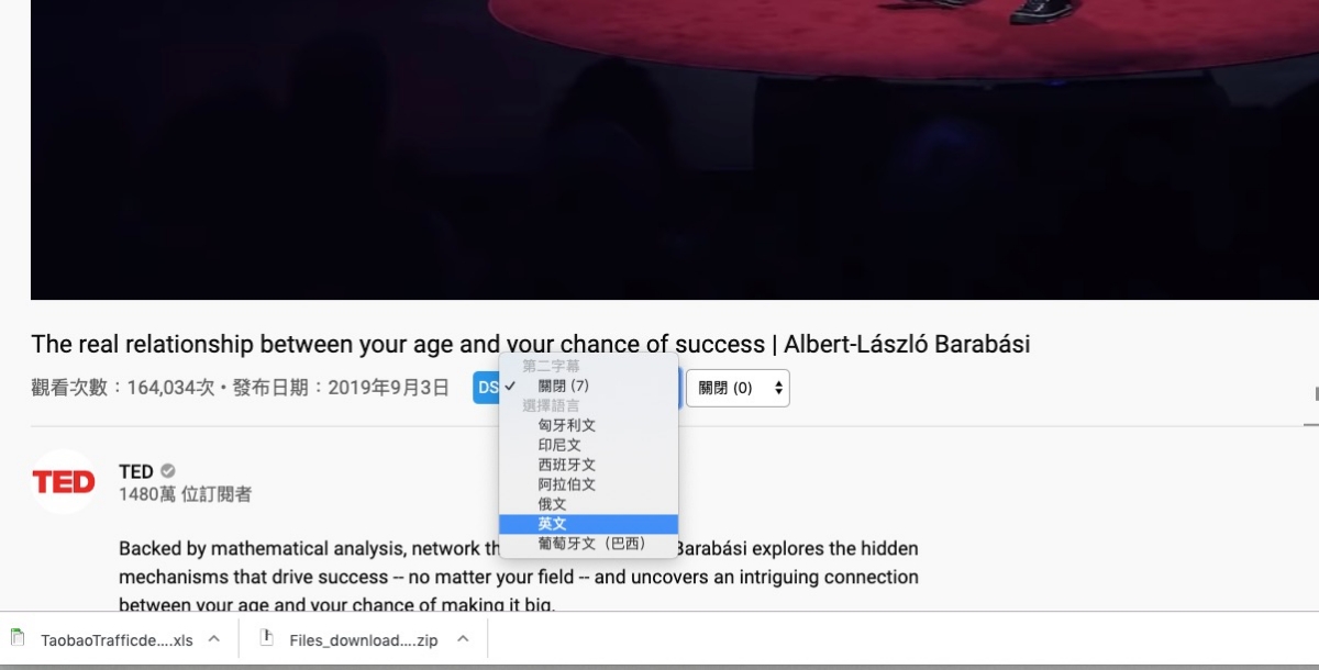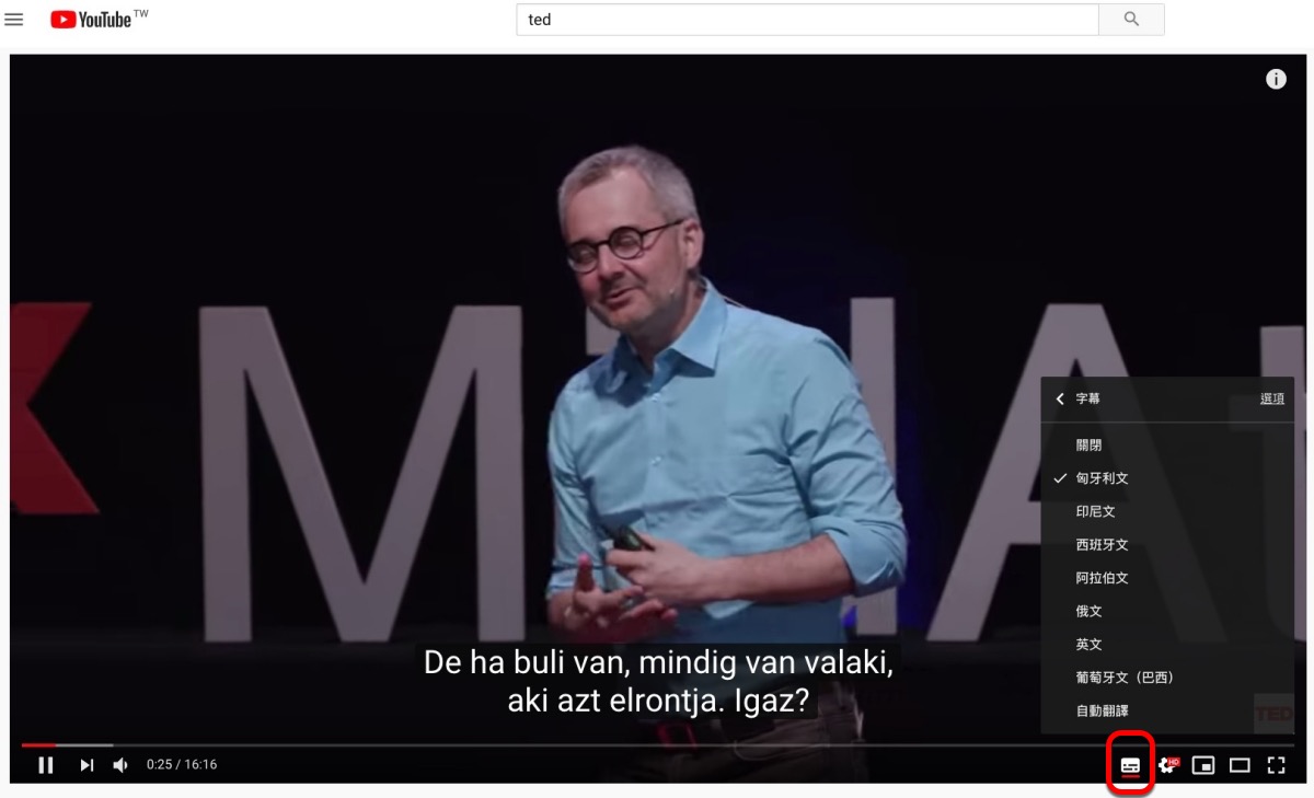 首先找個有 YouTube 原生字幕的 TED 影片,像這個就有很多語言,不過沒有中文,往下來看。