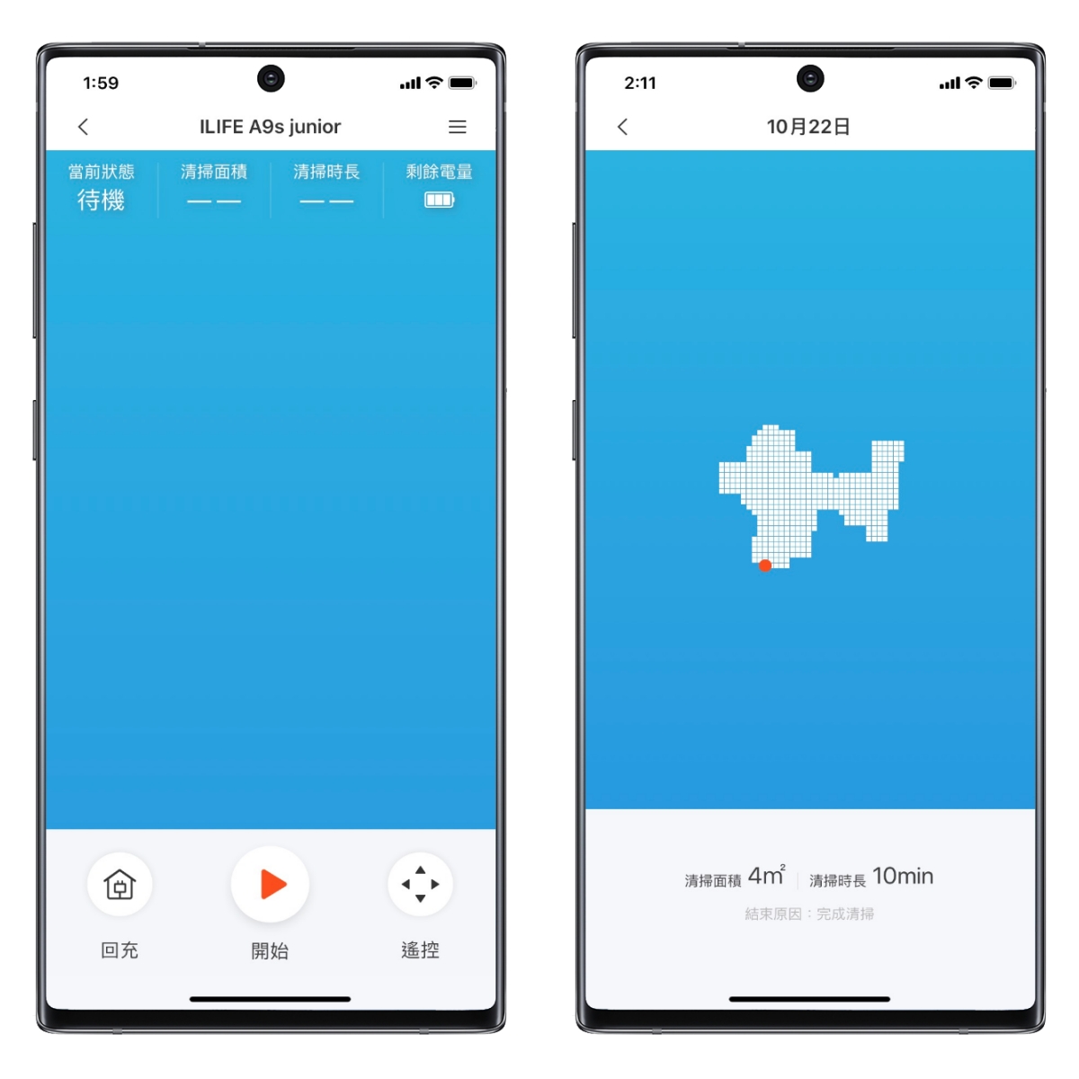 APP 的操作比起實體遙控器最大的差異主要是可以看到清掃路徑,當你讓 ILIFE A9s 運作時,可以在 APP 裡即時看到清掃路徑,以及最終清掃的區域範圍,另外還可以看到目前狀態、清掃區域多大以及清掃時間。