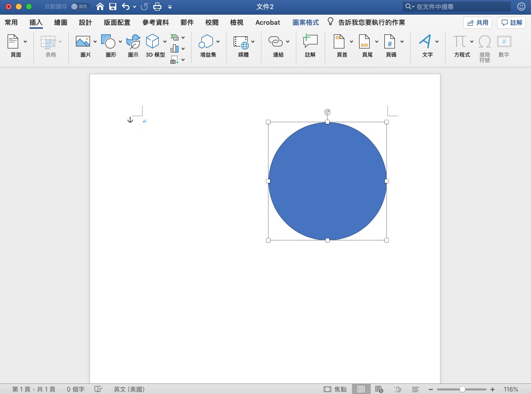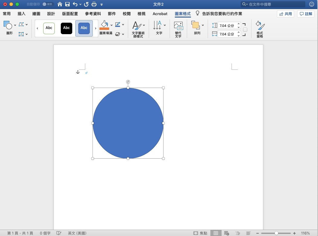 如同上一張圖片,先選好插入橢圓後,按住 Shift 鍵開始拉圖形,你會發現直接就是正圓了,完全不會像直接拉那樣變橢圓。