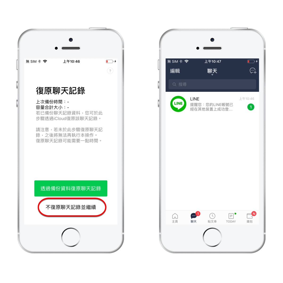 Android 聊天記錄搞定備份後,接下來請拿起你的 iPhone,下載 LINE 並登入,在登入時會出現要不要復原聊天記錄,請選擇不復原,登入成功後聊天區是空的,正常的,因為還沒開始匯入。