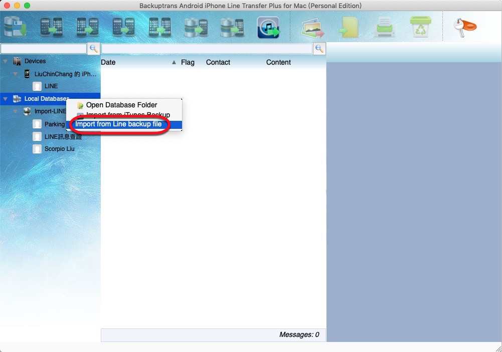在左邊 Local Databases 右鍵,選擇 Import from LINE Back file。