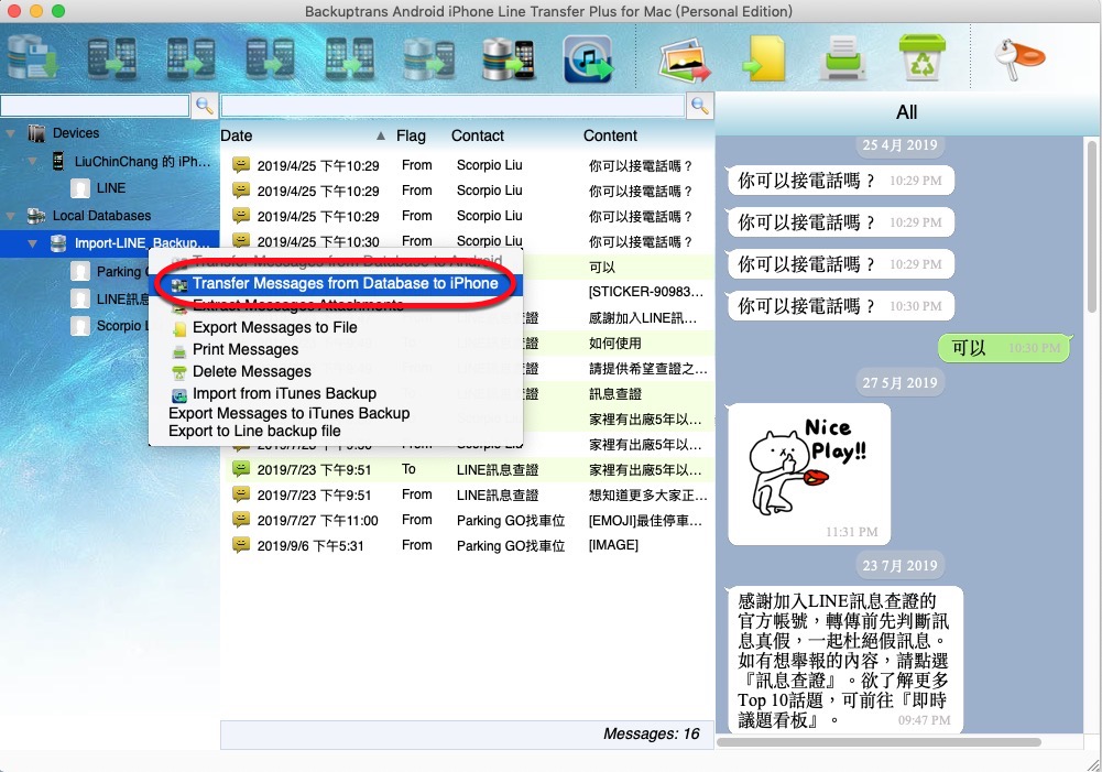 這邊就會看到你原本在 LINE 裡的訊息都匯入了,然後一樣在資料庫那右鍵「Transfer Messages from Database to iPhone」。