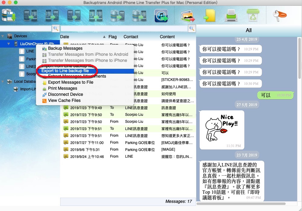 步驟跟前面差不多,就是反過來,軟體讀取到 iPhone 的 LINE 資料後,在左邊的 iPhone 右鍵選擇「Export to LINE backup file」,然後選擇存放的位置。