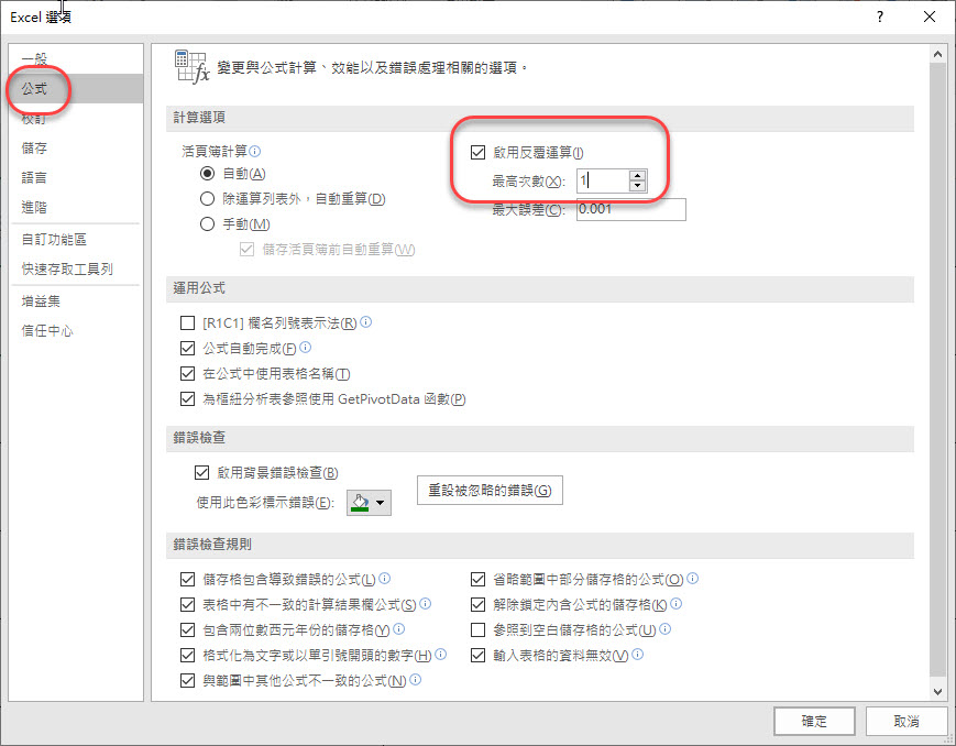 如果前面的公式選項沒有勾選反覆運算設定為 1 的話,這邊會出錯。