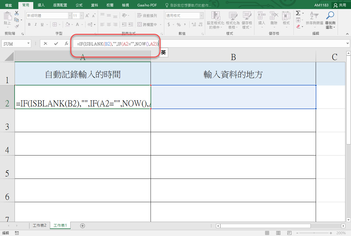 說明一下,第一個是判斷 B2 是否為空白,是的話就不顯示內容,如果不是就進行第二個 IF 判斷式,先判斷 A2 是否為空白,如果是的話,則顯示 NOW() 也就是目前的時間,而我們剛剛勾選的反覆運算設定為 1,就是讓 NOW 只進行一次計算,記錄下時間,不會再變動,因為 NOW 這個公式當你重開 Excel 檔案時預設是會再更新為目前的時間的。