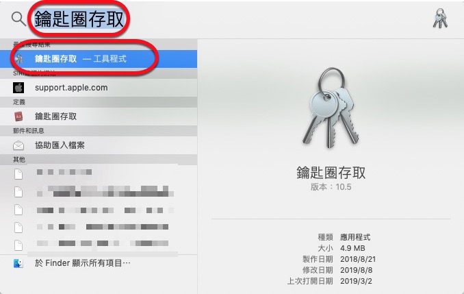 首先,從 MAC 系統中的搜尋(看你快捷鍵是什麼,預設是 Command + 空白鍵,或者在整個畫面最右上角也可以直接點擊),搜尋「鑰匙圈存取」,然後雙擊開啟。