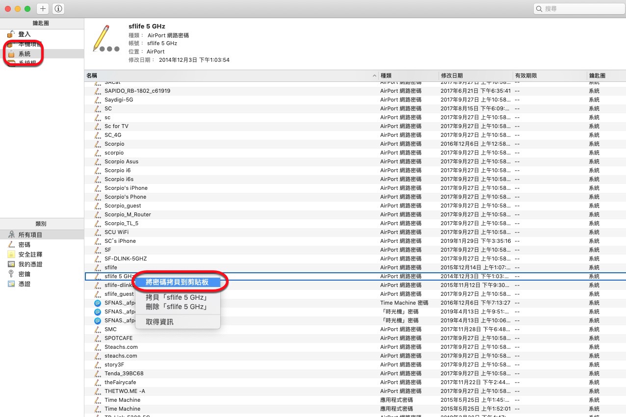 左邊選擇系統後,右邊這邊只要看到種類是「AirPort 網路密碼」的基本上全部都是連線過的 Wi-Fi,找到你想要取得密碼的那個 SSID,比如阿湯用自己家的,你可以直接右鍵「將密碼拷貝到剪貼板」。