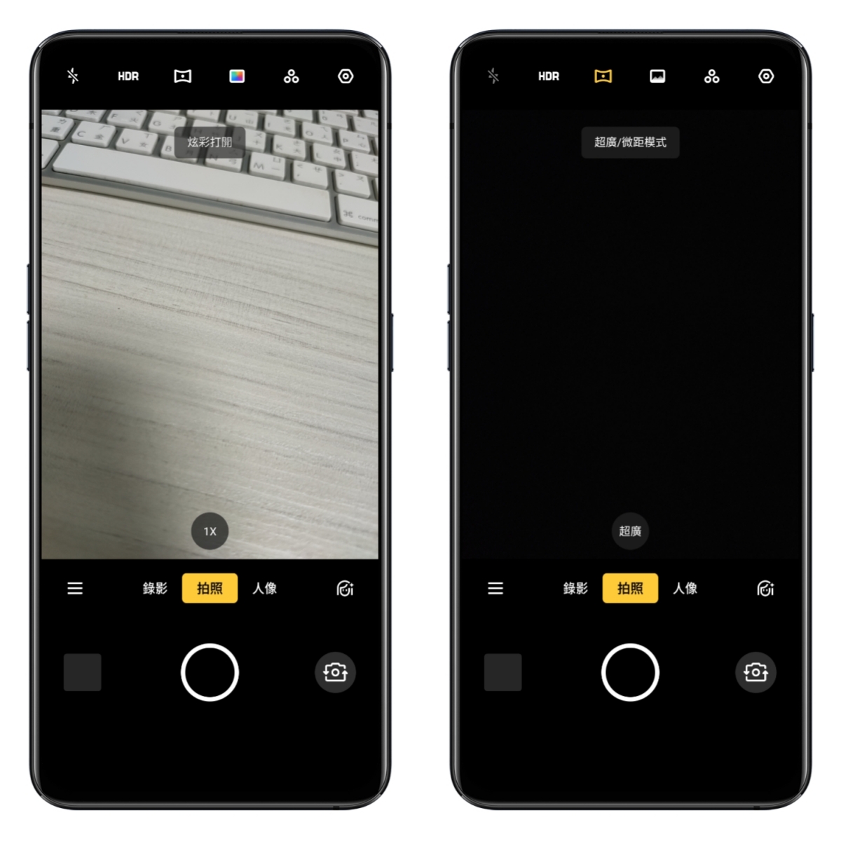 上方可以開啟炫彩模式,讓整體畫面的色彩更加飽和,如果是用在拍攝風景上使用,會有相當加分的效果,另外超廣角/微距模式也在上方直接開啟使用,這邊要注意一下,2.5cm 的微距拍攝,僅在超廣角模式下使用。