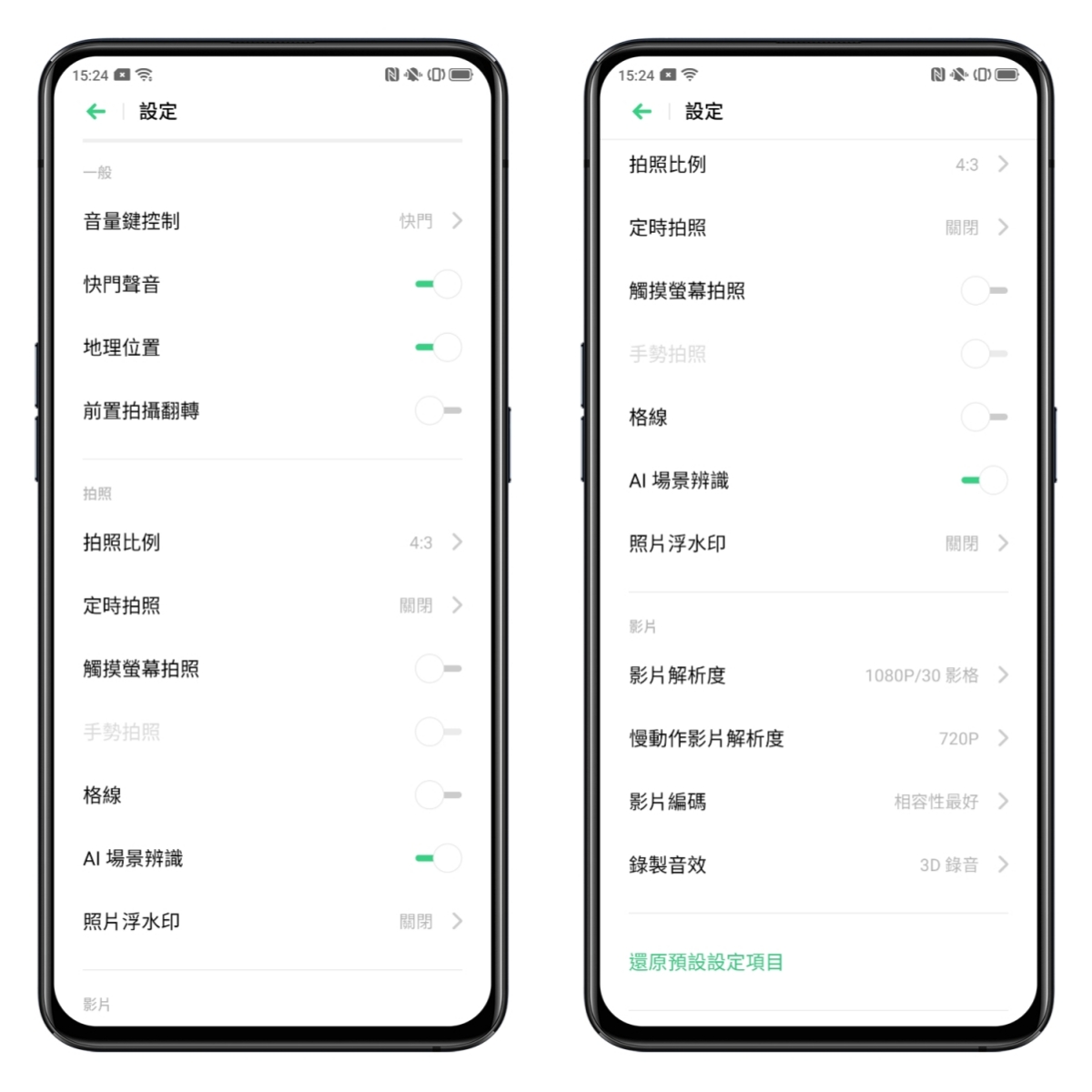 設定的部份比較可以注意的是開啟格線輔助拍照,以及 AI 智慧場景辨識會自動幫你辨識畫面提供最佳的拍照參數。