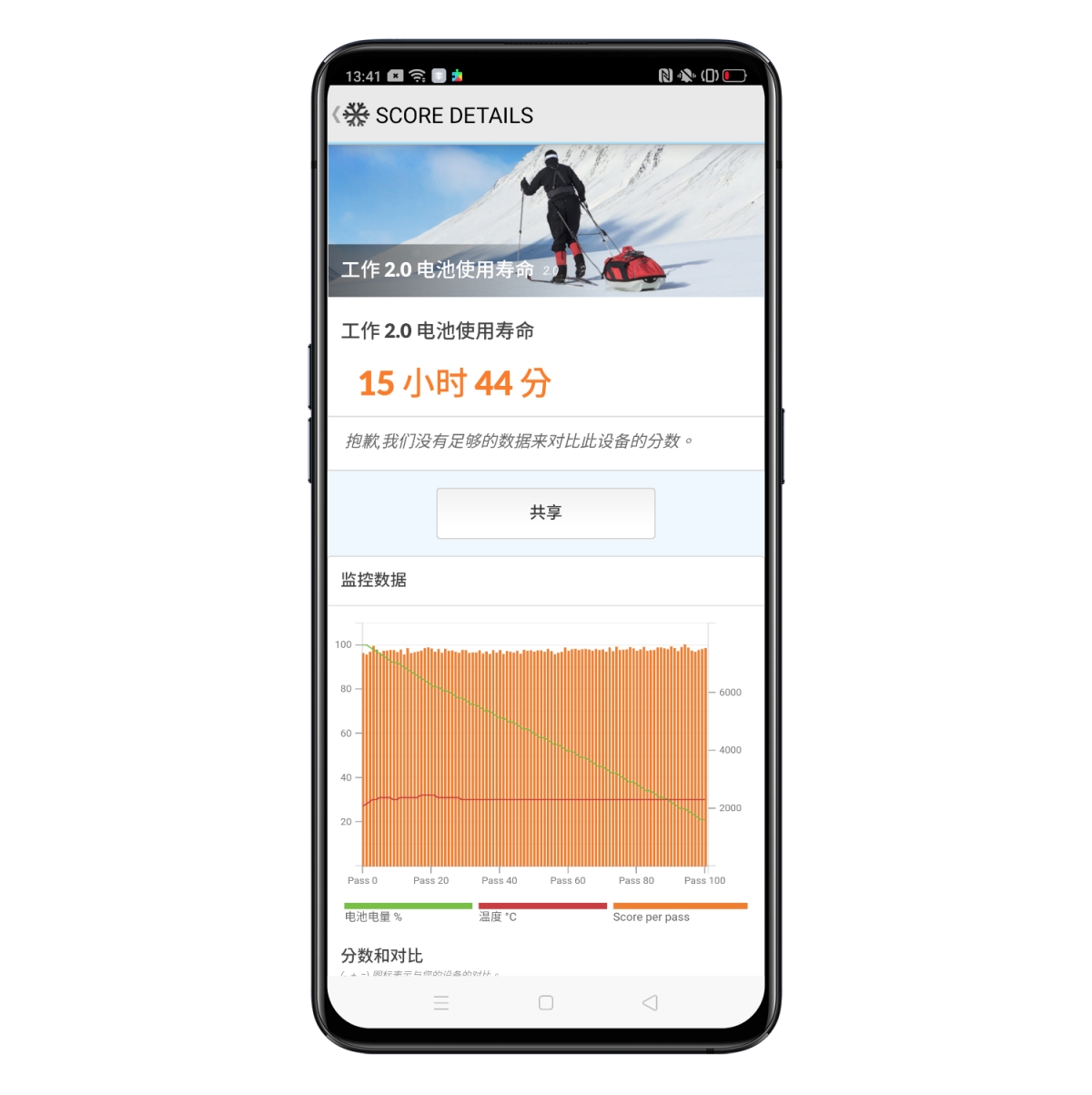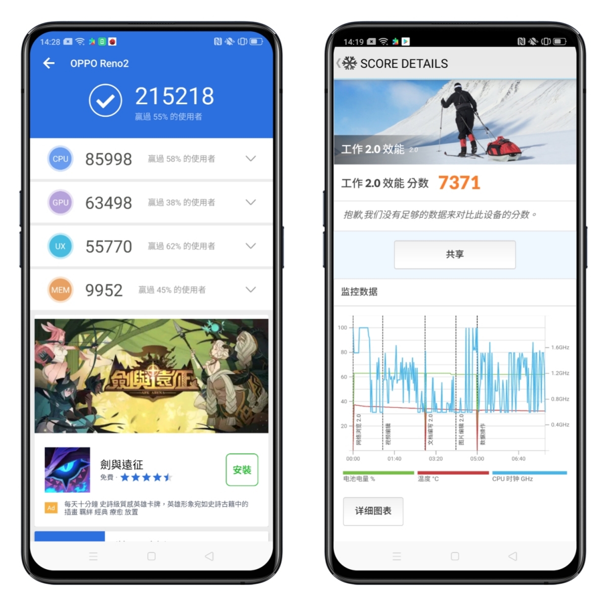 前一代的 OPPO Reno 標準版是使用高通 S710 處理器,安兔兔大約是 17 萬分左右,而這一代的 OPPO Reno2 是採用 S730G,效能進步了 30% 左右,提升至近 22 萬分。 透過 PCMark 測試工作 2.0 效能分數是 7,371。