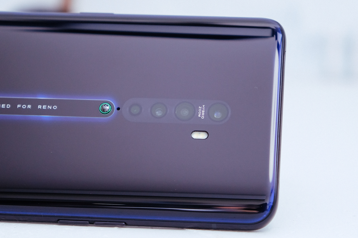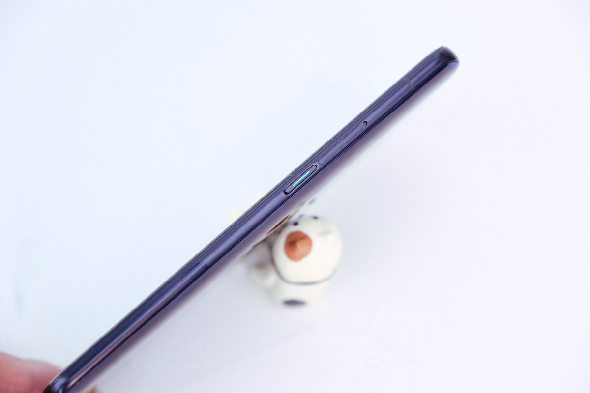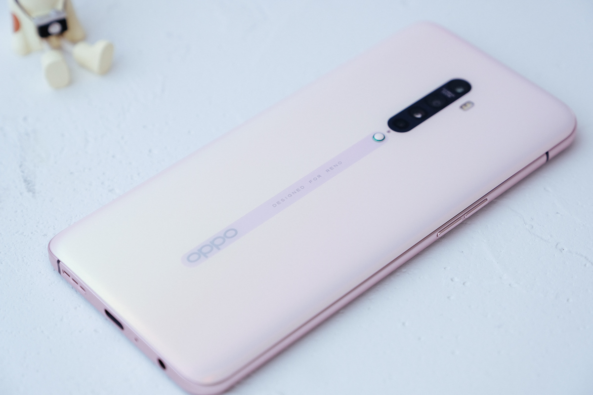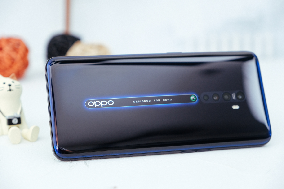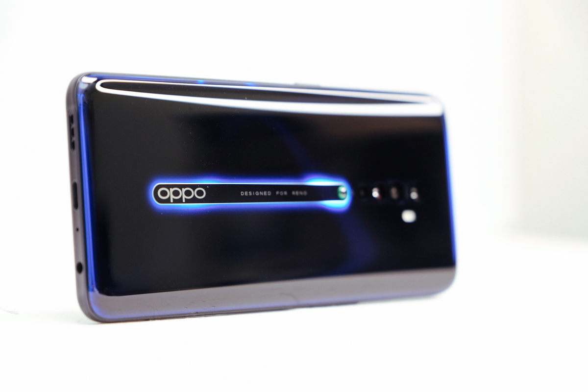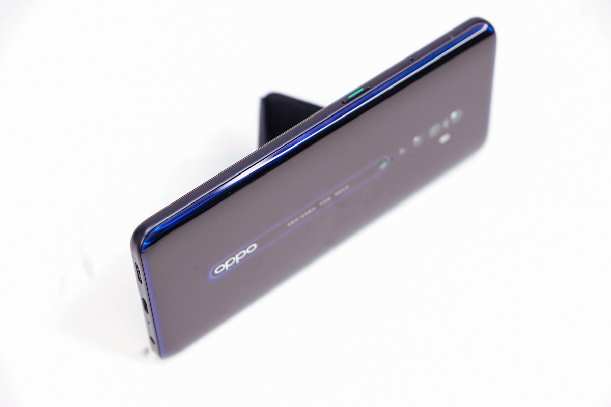 背面的整體設計是延續上一代的 OPPO Reno,不過呢!這次又更加的美,像是下面這是深海夜光色,中間 OPPO Logo 的那橫條的周圍會依據不同角度的環境光折射,顯示出閃亮的藍色光感,很像是真的有加入一圈 LED 一樣,超美!