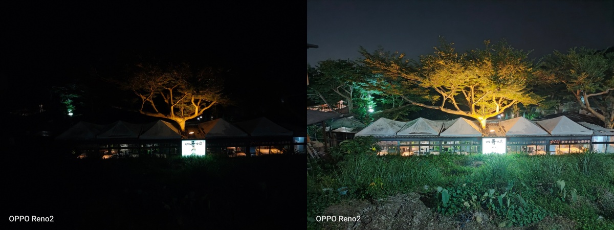 而這次 OPPO Reno2 的夜景模式加入了全新的「極夜模式」,當環境光源暗到一定程度時,當你使用夜景模式拍攝會自動轉為極夜模式,比如下圖左,是原本未開啟任何模式所拍攝的,當下的環境差不多就是這麼暗,什麼都看不到,而下圖右則是開啟夜景模式後所呈現來的畫面,是不是相當驚人。