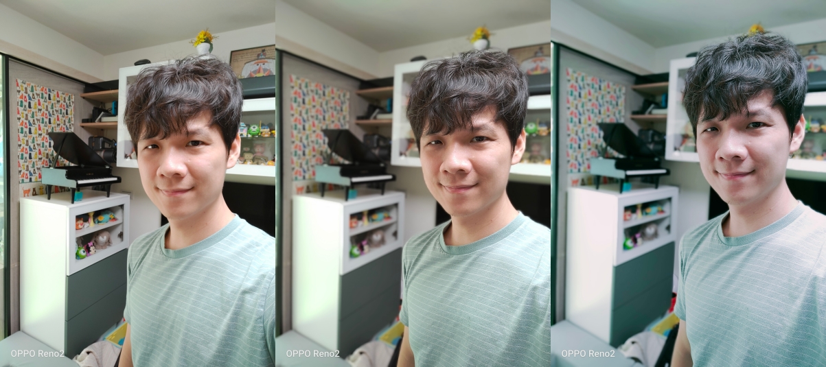 由左至右分別是單純 AI 美顏、人像模式 + AI 美顏、人像模式 + AI 美顏 + 濾鏡。