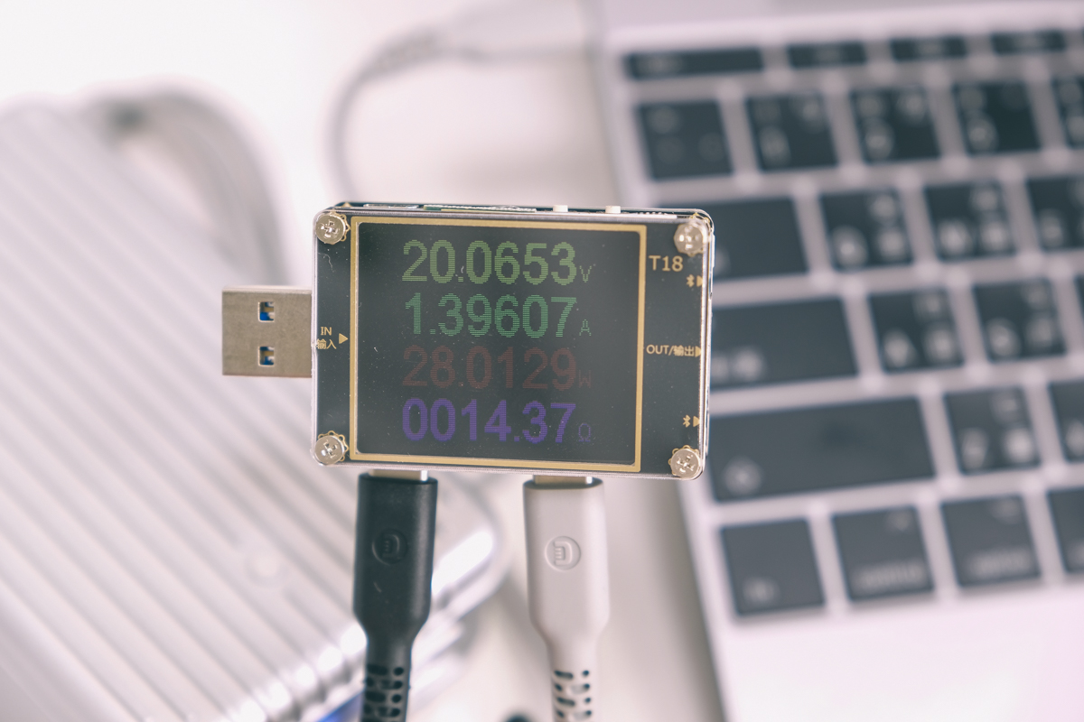 阿湯也實際用了功率檢測器來測輸出的功率狀況,以我手邊最高瓦數的 MacBook 來說,我是接上 PD 100W 的輸出埠進行充電,會看到瓦數就是固定在 28~29W 之間,就是火力全開的進行充電。