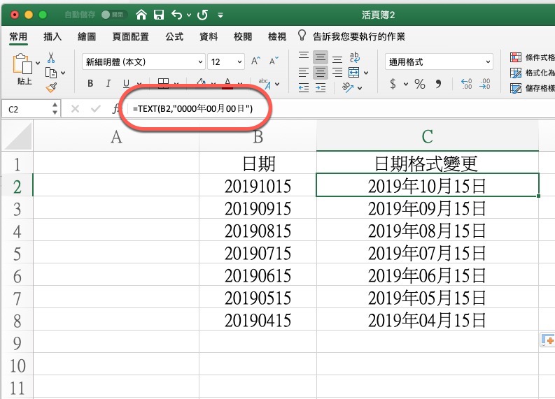 這是最最最基本的用法,來說明一下,B2 就是來源內容,而後面的 0000年00月00日呢,這裡的 00 會從來源內容裡的最右邊開始取代,比如 B2 最右邊二個是 15,就會放進 00日,變成 15 日,以此類推,因此公式其實也可以寫成: