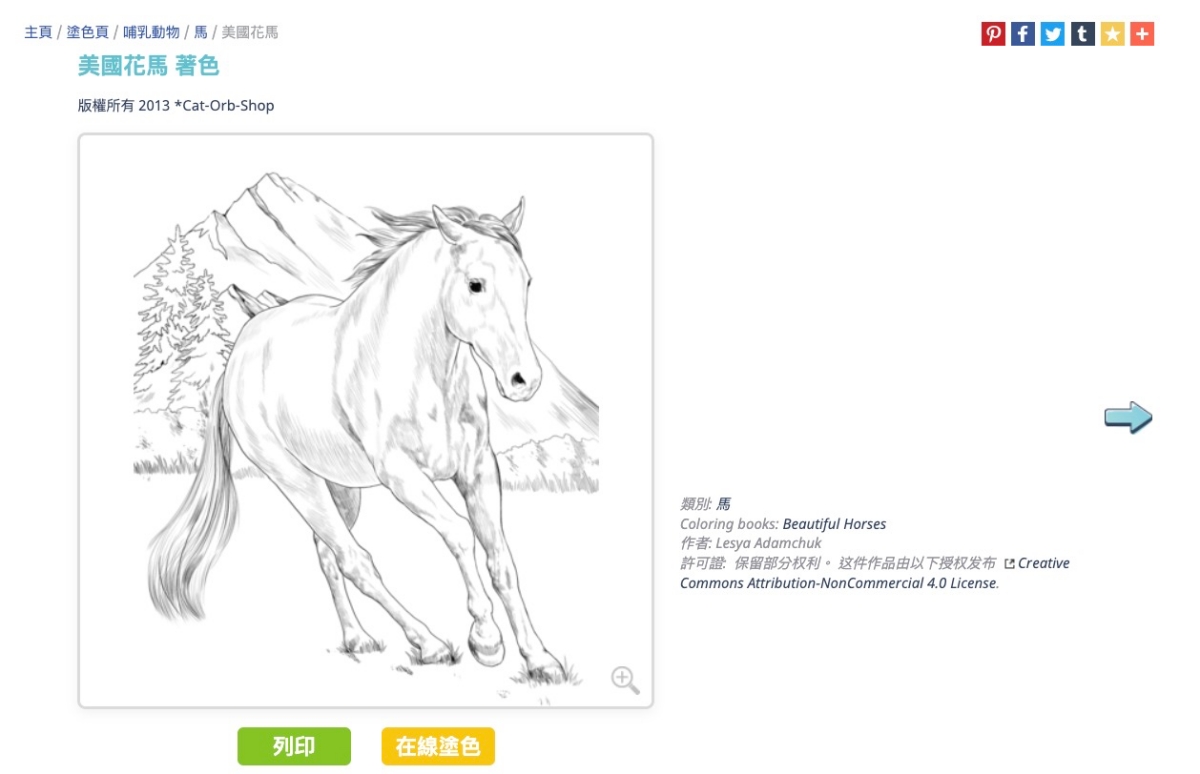 隨意點一個著色書進入後,像是馬,裡面還分了超多種類的馬可以選擇。