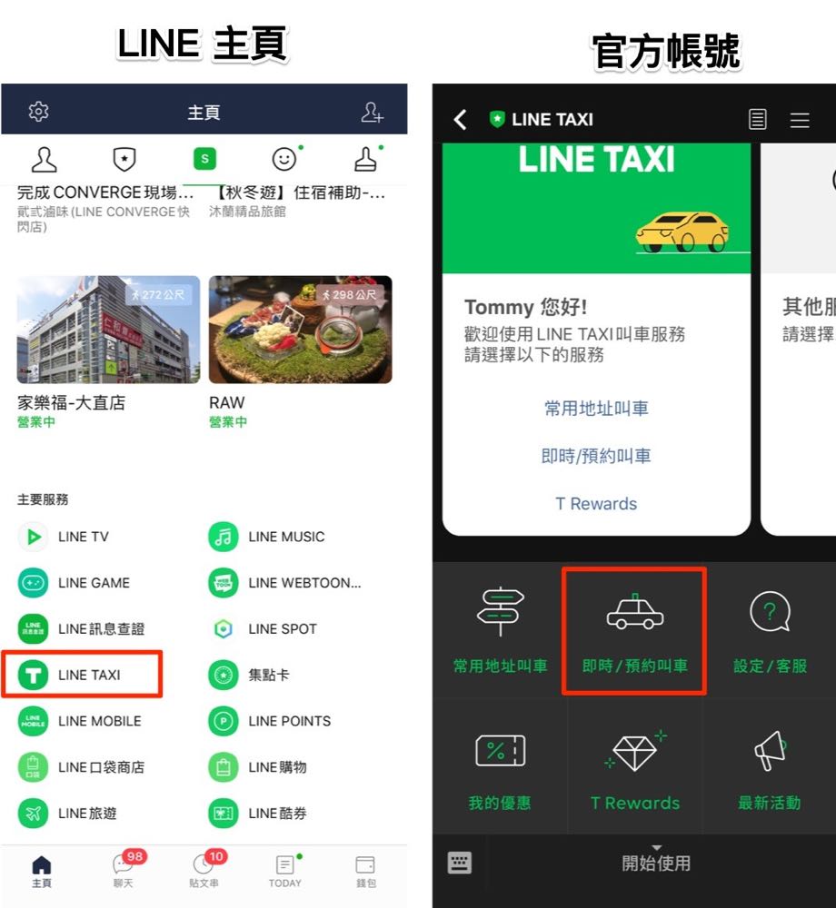 從 LINE 主頁中的「服務」或 LINE TAXI 官方帳號進來都可以叫車。