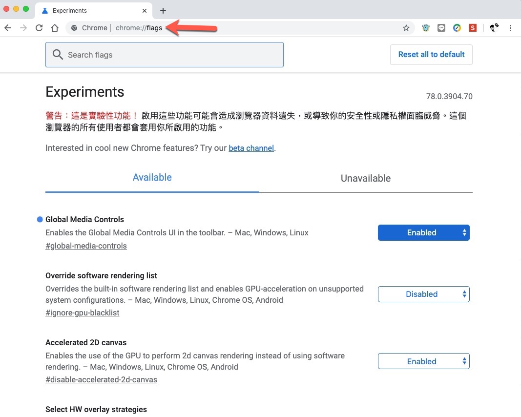 在 Chrome 的網址列輸入 chrome://flags,然後前往,就會出現一堆可以啟用的項目,不過不清楚的話不要亂啟用,如果出了什麼奇怪的問題,可以再回到這一頁點擊右上角的 Reset all to default,就會將你的設定都還原了。